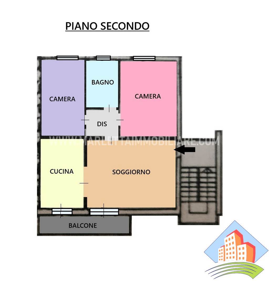 - P2(no ascensore): Soggiorno, cucina abitabile (entrambi serviti da balcone),